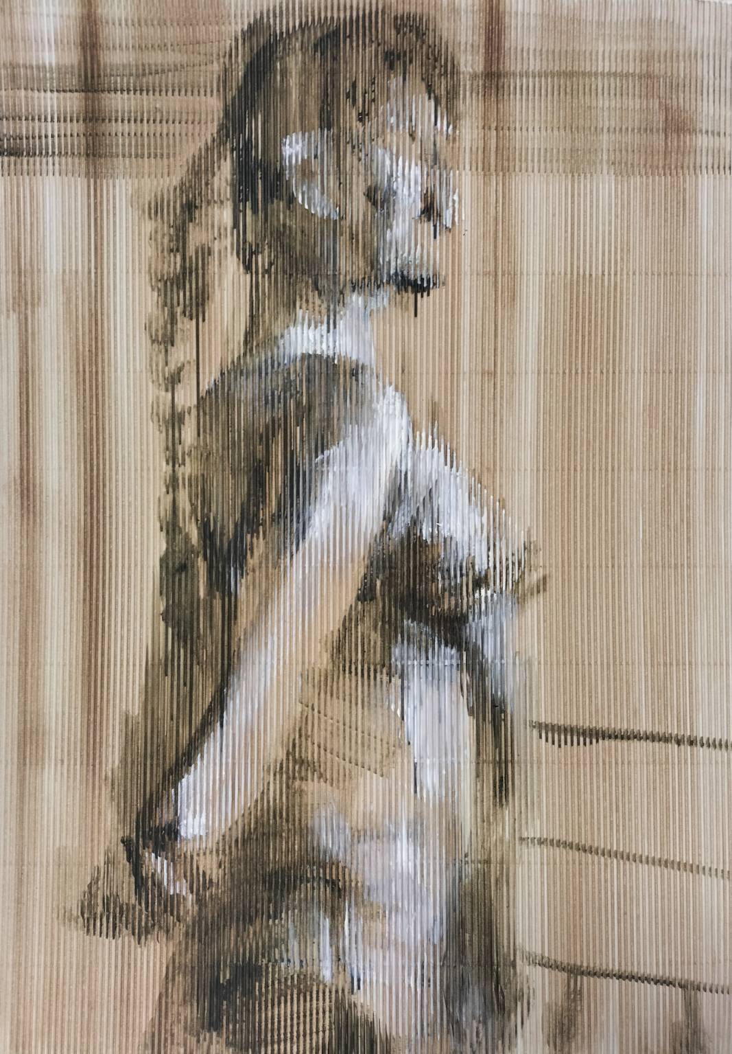 ヌードモデルを、巻段ボールに油絵の具で描いたドローイング作品です。